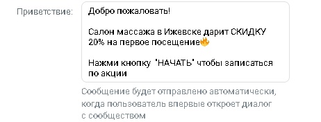 Одногруппница порекомендовала меня как хорошего таргетолога. Задача от Заказчика: «Раскачать» группу массажного салона. Отмечу, что у Заказчика в группе были сообщения, но не было настроено ни чат-бота, ни воронки трафика. Не было никаких приветственных бонусов.